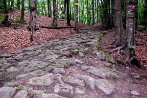 Dal borgo si comincia finalmente a pedalare sull’antica strada militare romana oggi ridotta a un saliscendi dal fondo sconnesso che mette a dura prova l’equilibrio del biker e gli pneumatici.